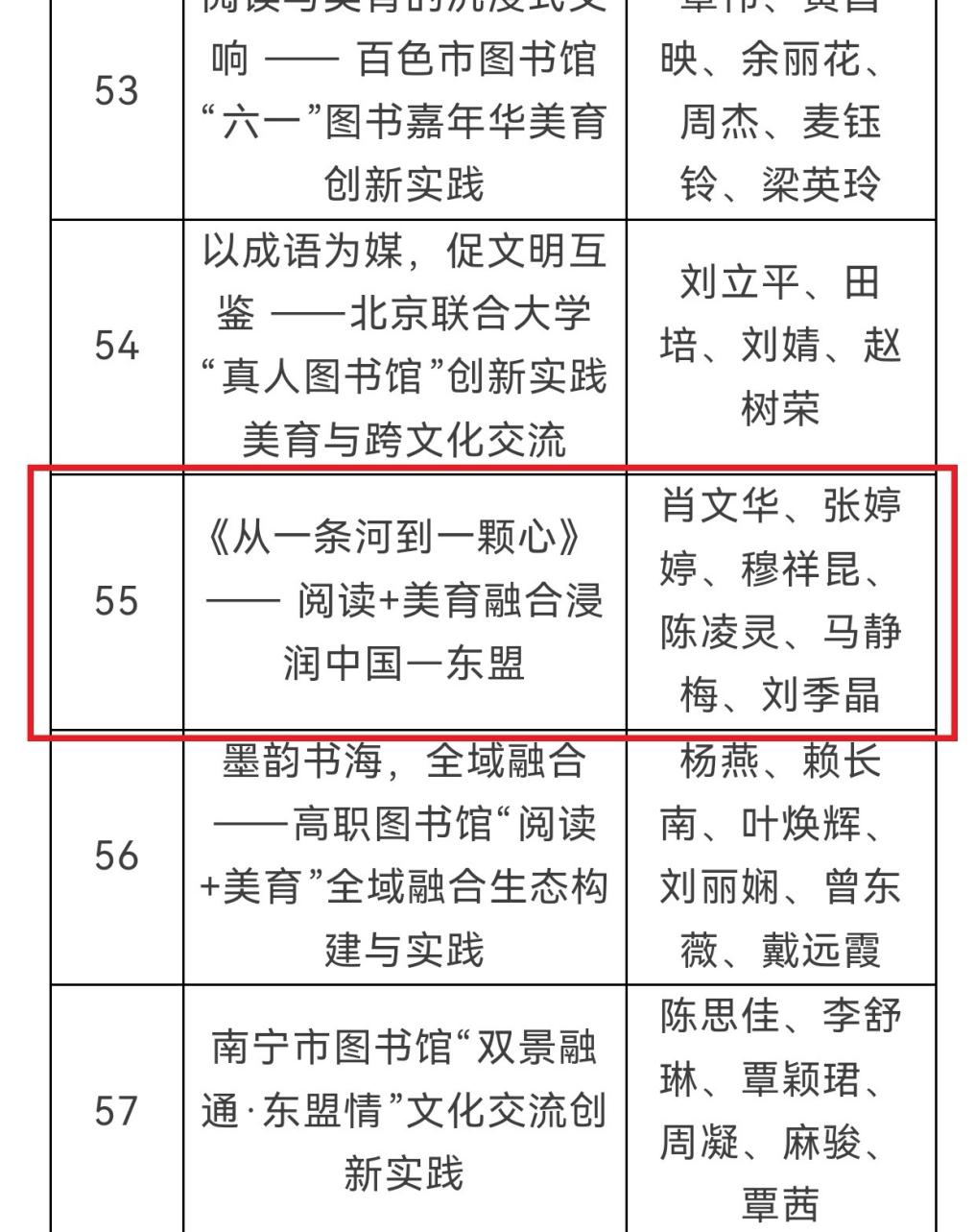 第六届中国—东盟文化创意周高端论坛在广西南宁举办。图书馆申报的案例《〈从一条河到一颗心〉——阅读+美育融合浸润中国—东盟》荣获优秀案例。本次论坛以“美育无界・融合共生——同筑中国—东盟文化创意新生态”为主题,共征集到案例368件,经多轮评审,最终评选出73件优秀案例。
