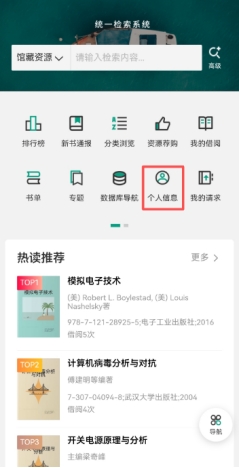 2.在微信公众号页面最下方的菜单栏中,点击“馆藏检索”,然后进入检索页面点击个人信息,即可查询个人账号信息。